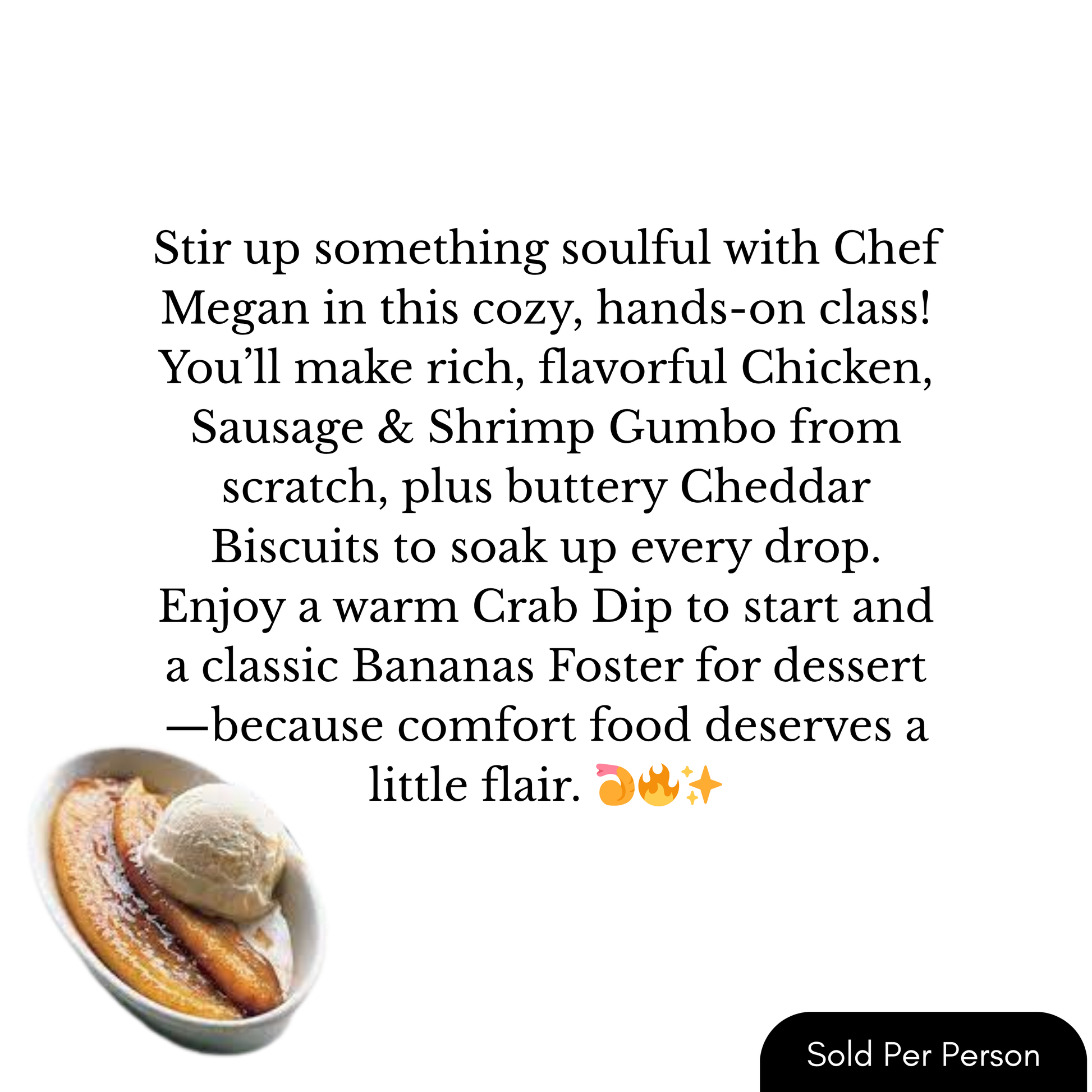 To start, you’ll enjoy a decadent Crab Dip—creamy, savory, and served fresh from the oven. Then, roll up your sleeves to make buttery, golden Cheddar Biscuits from scratch, the perfect side for soaking up every last spoonful of gumbo. Finally, end the evening with a tableside showstopper—Bananas Foster, caramelized to perfection and served warm.