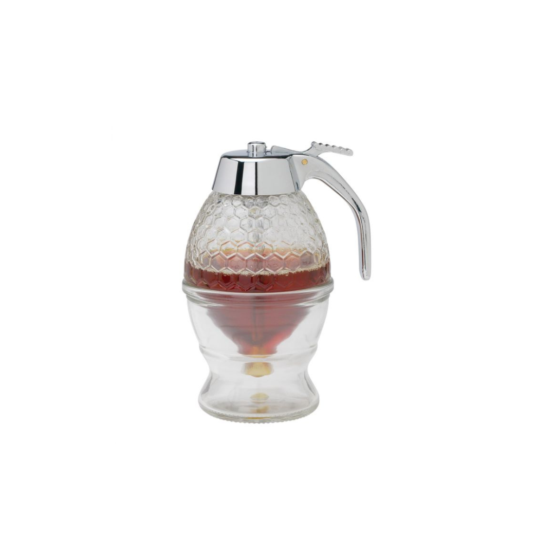 Discover how Mrs. Anderson's Glass Syrup Dispenser keeps your syrups and honey contained without any sticky, messy mayhem. Its playful honeycomb design adds a whimsical touch to any mealtime. Perfect for breakfast, lunch, dinner, and tea time, the dispenser's clever center spout pours smoothly and stays tidy. With easy one-handed operation, just press the lever to dispense your desired amount, then release when finished. The inner stopper prevents any messy drips or leaks. The glass stand catches any drips and can also be filled with warm water to keep your contents soft and warm. With an 8-ounce capacity, you'll always have syrup and honey at the ready. This sturdy dispenser, made of glass, silicone, and plastic, is easy to clean by hand with warm, soapy water.