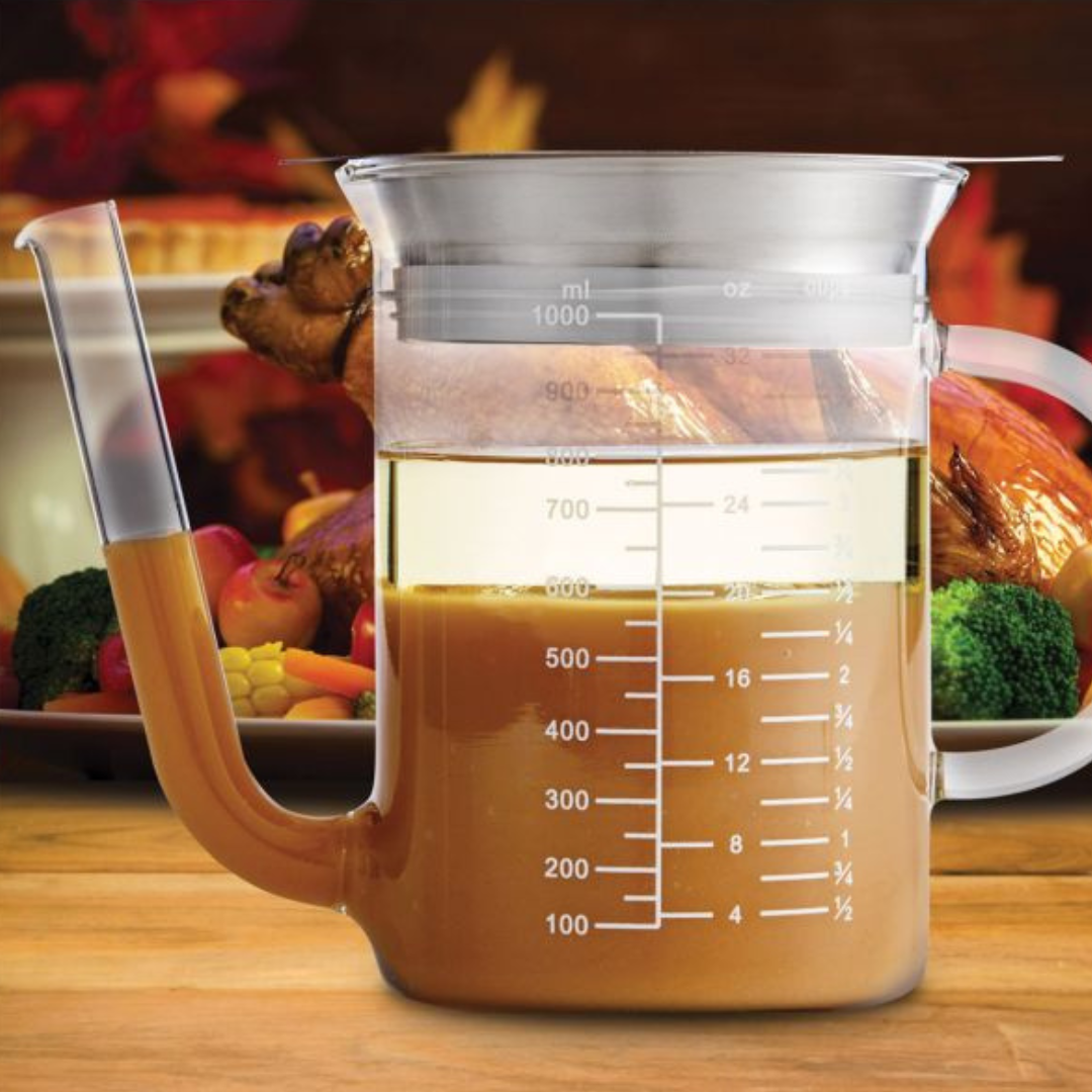 This sleek, 4-cup pitcher effortlessly strains out fat and lumps from your delicious pan drippings, giving you rich, smooth gravy every time. Made from sturdy borosilicate glass, stainless steel, and food-safe silicone, it’s perfect for everything from gravies to broths. With easy-to-read measurements and a low-set spout for mess-free pouring, you can reheat right on the stovetop or in the microwave (up to 300°F). Say goodbye to lumpy sauces and hello to culinary perfection!