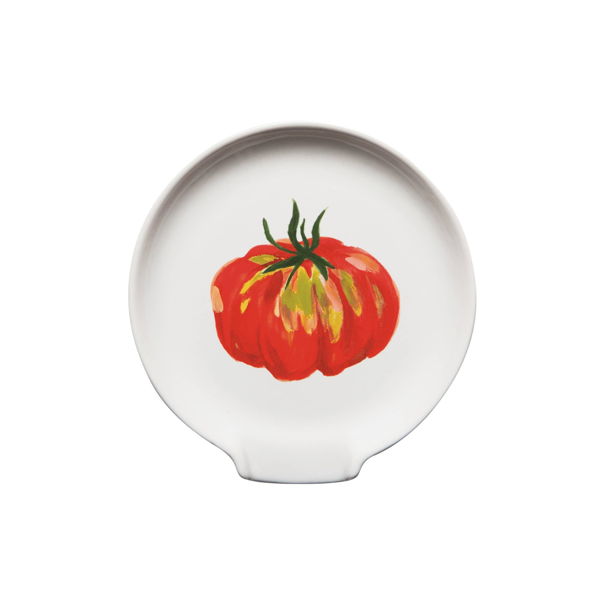 Playful colors of robust red and orange, sun-ripened yellow and green adorn the Heirloom Tomatoes Printed spoon. This delightful spoon rest is a welcome addition to any kitchen. A motif adds character, while a divot allows spoons to rest comfortably. Part of the Heirloom Tomatoes collection.