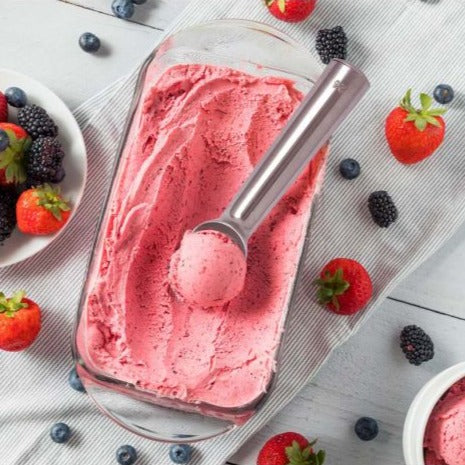 The Anti-Freeze Ice Cream Scoop effortlessly forms perfect scoops of ice cream and other frozen treats without sticking. Crafted from heavyweight aluminum, it features a handle filled with non-toxic, self-defrosting liquid that warms to the touch, ensuring easier and faster scooping. The sturdy and durable scoop has a curved design with a beveled edge, allowing it to dig into hard ice cream without straining your hand. This scoop is ideal for ice cream, frozen yogurt, gelato, sorbet, Italian ice, and various frozen treats.