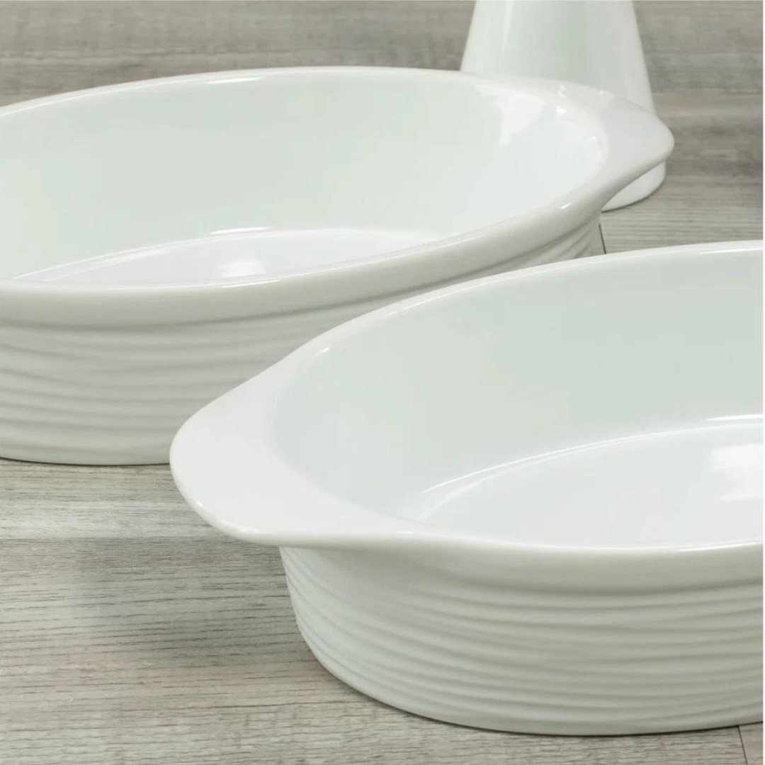 This classic white au gratin dish features a unique rippling pattern, adding an elegant touch to your table setting. Each au gratin has a 28-oz. capacity and is oven, microwave, and dishwasher safe for easy use and cleaning. These versatile dishes are a must-have for your kitchen, perfect for baking your favorite sides or desserts.