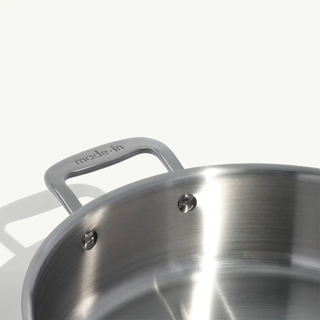 Crafted in Italy, the Stainless Clad Rondeau is constructed from 5 layers of metals for improved heat conduction and distribution. Because it prevents the hot spots that lead to stuck-on messes, the 5-ply construction also cleans up in seconds. Its rolled rim allows you to pour without spilling, and two looped handles make transport from stove to oven to table a breeze.
