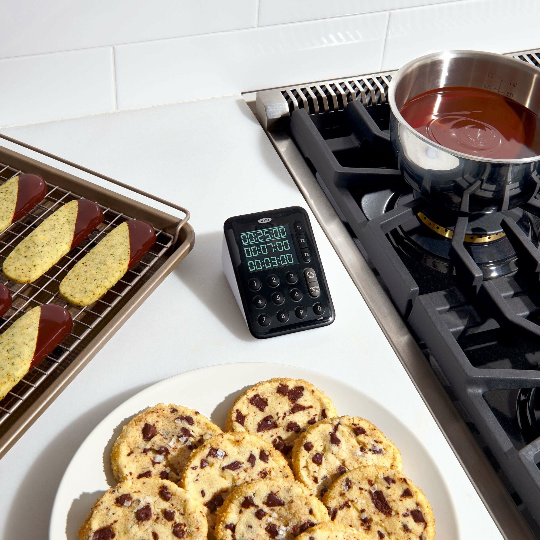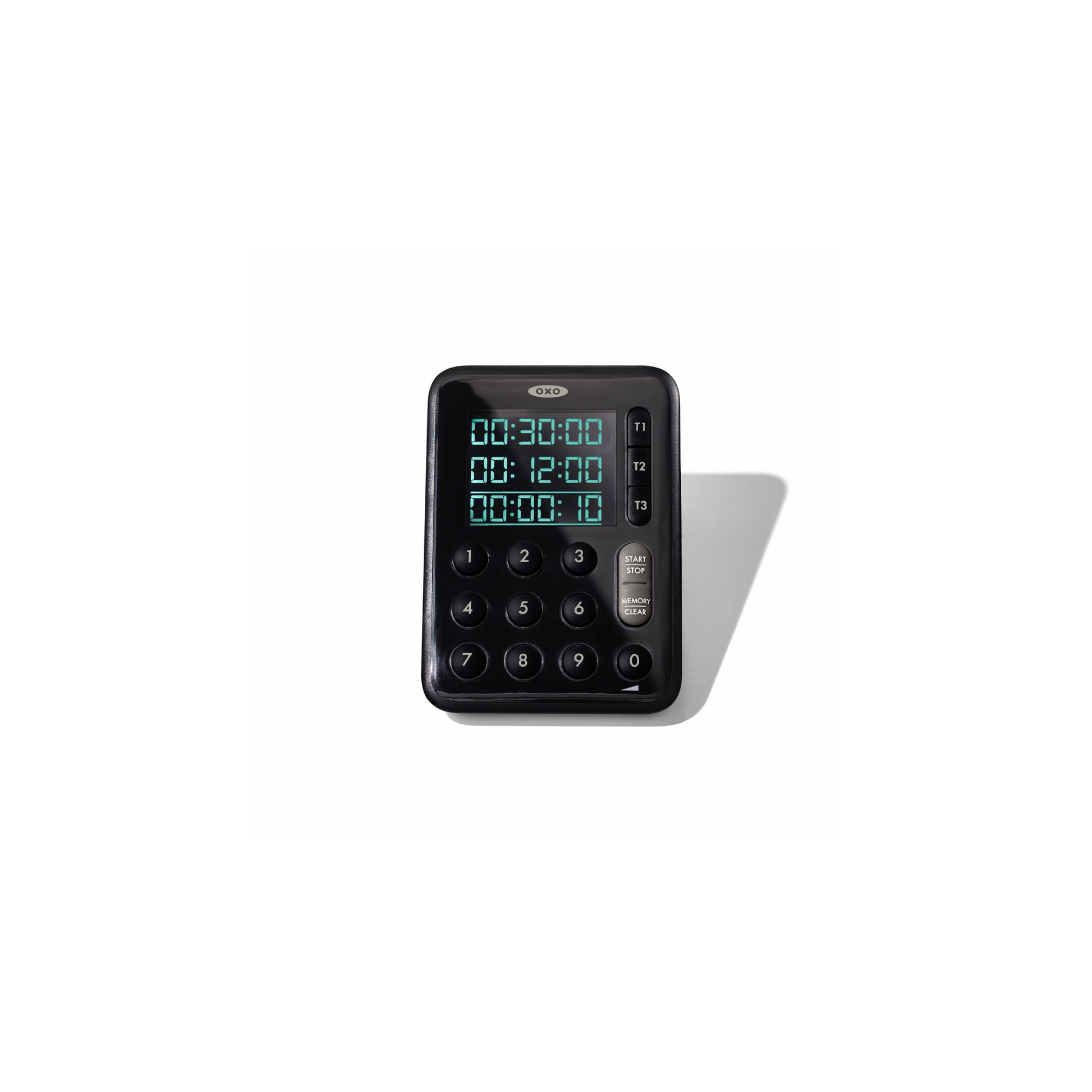 The OXO Good Grips Triple Task Kitchen Timer is your kitchen's time-juggling superhero! This clever gadget tracks three different cooking times at once with easy one-handed operation. Each timer has its own unique beep pattern, so you'll know exactly which dish is ready without looking. With adjustable volume, backlit display, and even a stopwatch function, this little multitasker makes cooking multiple dishes as fun as a kitchen dance party!